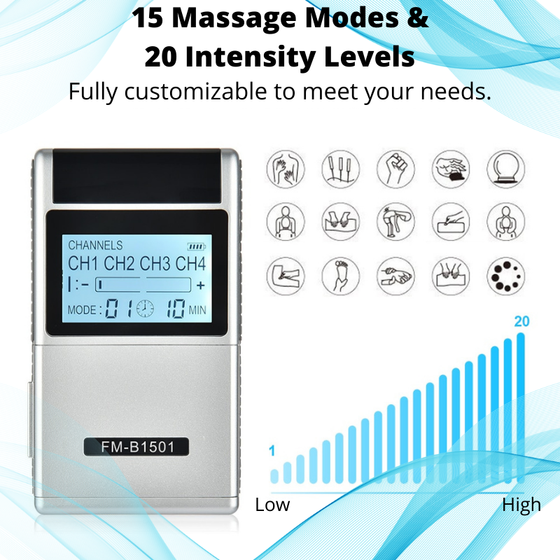 15 Mode and 4 Channel Tens EMS Muscle Stimulator 15 MODES 4 CHANNELS & 20 INTENSITY LEVELS: 15 different pre-programmed stimulation modes for multipurpose massage experience to effectively relieve pain and fatigue, promote blood circulation and metabolism, or stimulate muscle for enhanced mu...